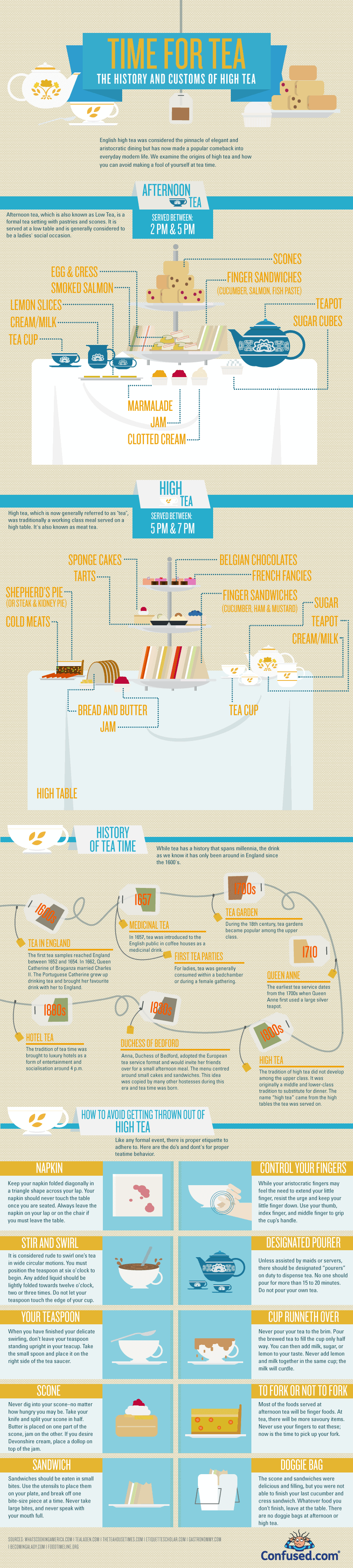 With high tea happening less on land and more flying high in the sky – have you ever wondered where high tea started? What the history was? Well this amazing info graphic, via confused.com, tells the different customs and history of tea: